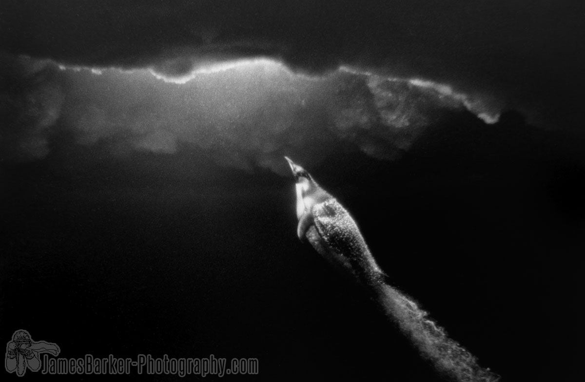 From an underwater viewing station, a penguin heads to the surface. The “contrail” is more visible than the scientists had been able to photograph. It solved the question as to how the contrail is formed, from air kept under the feathers, not the lungs. The photo appeared in a scientific journal article.8868