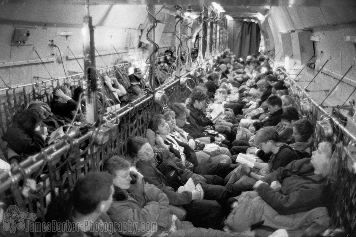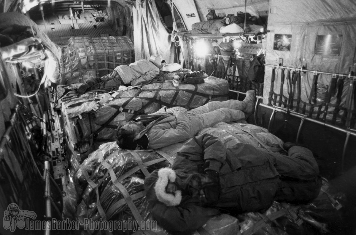In an Air Force C-141, 132 scientists and support staff make the 5 1/2 hour flight from New Zealand to McMurdo Station. Dressed in "extreme cold weather" gear, the women are seated in front so they can use the crew facilities under the flight deck. Men are in back so they can use the funnel behind the curtain.