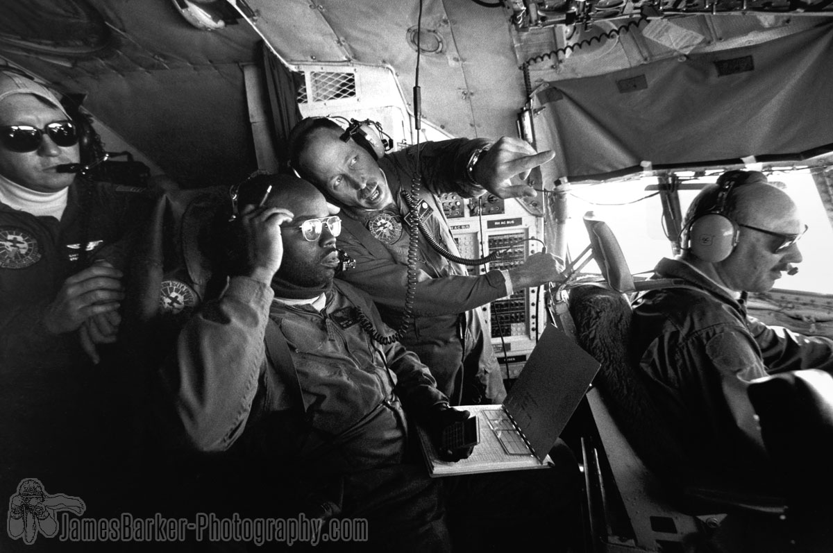 The crew confers on the flight deck of a LC-130 en route to the South Pole Station in one of the season’s 146 scheduled flights.