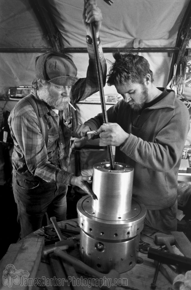 Ice core drillers, Dave Giles and lan Dolman repair a drill motor at Siple Dome on the western ice sheet.