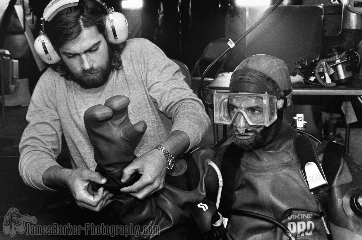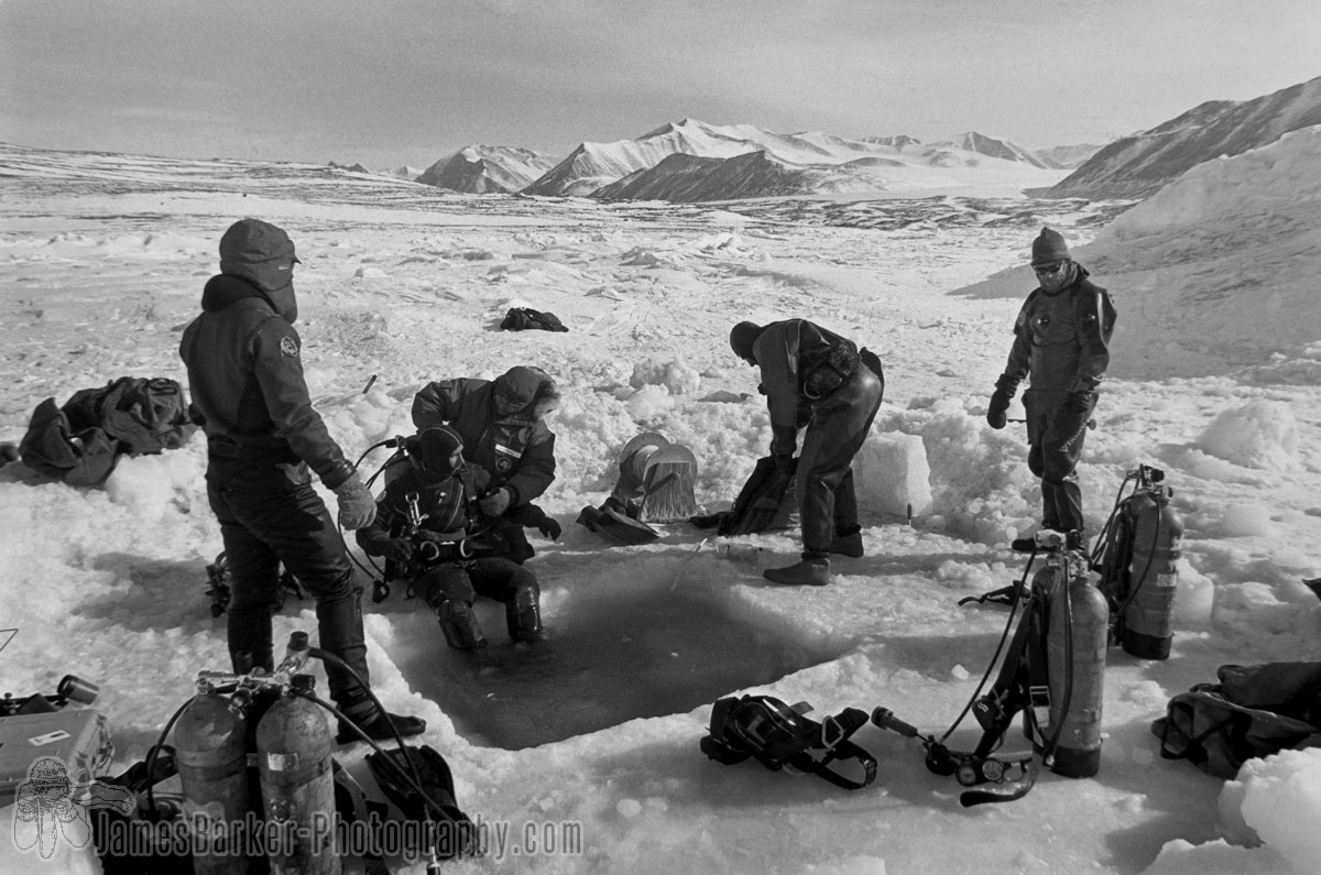Chris Moeller helps prepare Chuck Amsler, who will descend beneath the ice at New Harbor at McMurdo Sound.