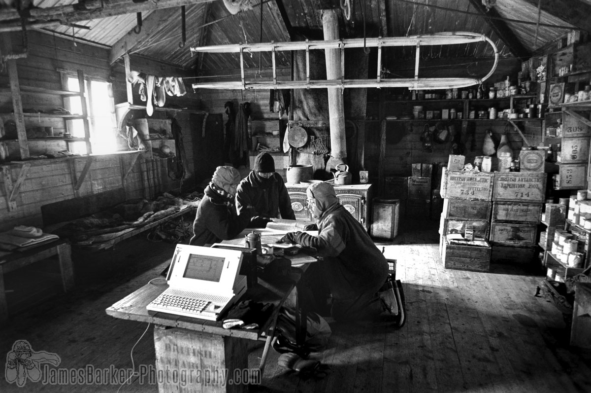 Members of the New Zealand-based Antarctic Heritage Trust discuss the preservation of artifacts in Shackleton’s hut, built at Cape Royds in 1908.